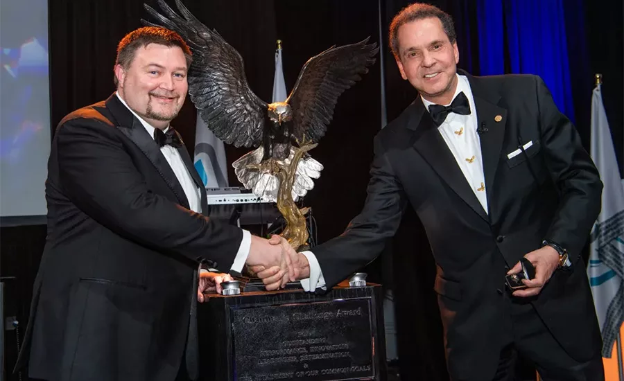 Nathan Murphy, GSF Group vice president, operations – Protein Products (left) accepts GSF’s 2021 Chairman’s Challenge Award, presented by Mark Wetterau, GSF chairman and chief executive officer (right). Photo courtesy Golden State Foods