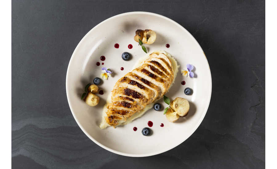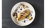 Cultivated chicken breast from SuperMeat with blueberries and roasted garlic.