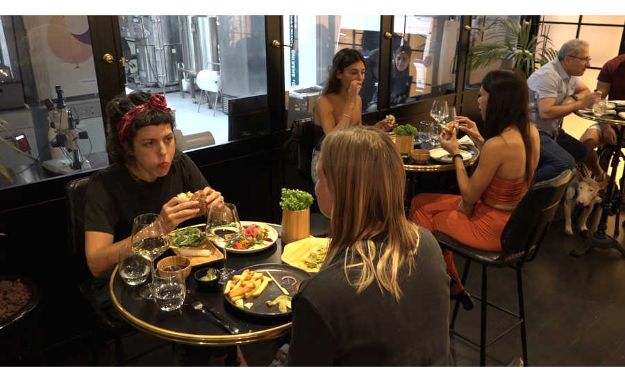 SuperMeat's pilot plant (seen through the window behind the diners) is connected to a small restaurant called The Chicken, serving SuperMeat's cultivated chicken on the menu.
