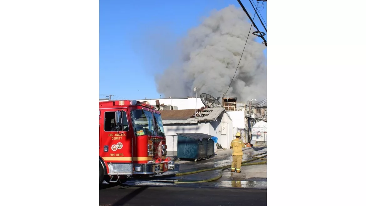 Los Angeles County FD responds to a fire at a poultry processing plant in Montebello, CA.