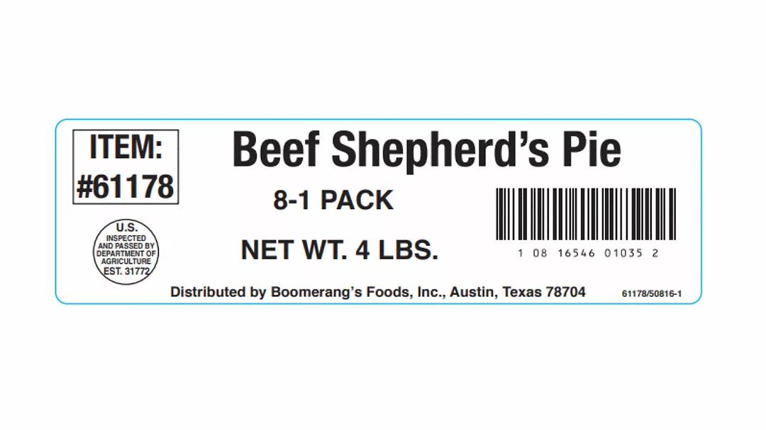 Recall of Lone Star Bakery’s Boomerang’s Beef Shepherd’s Pie