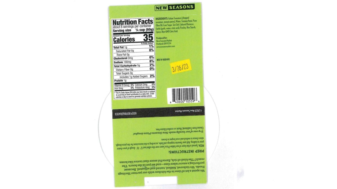 The fully cooked, RTE pasta sauce items are labeled as pizza sauce, produced on January 25, 2023 and are in a 16-oz. tub stating, “NEW SEASONS BRIGHT & FLAVORFUL HOMESTYLE PIZZA SAUCE with slow-simmered plum tomatoes,” on the label. The best if used by date is March 26, 2023. The product subject to the public health alert does not bear a USDA establishment number or mark of inspection. These items were shipped to retail locations in Oregon and Washington.