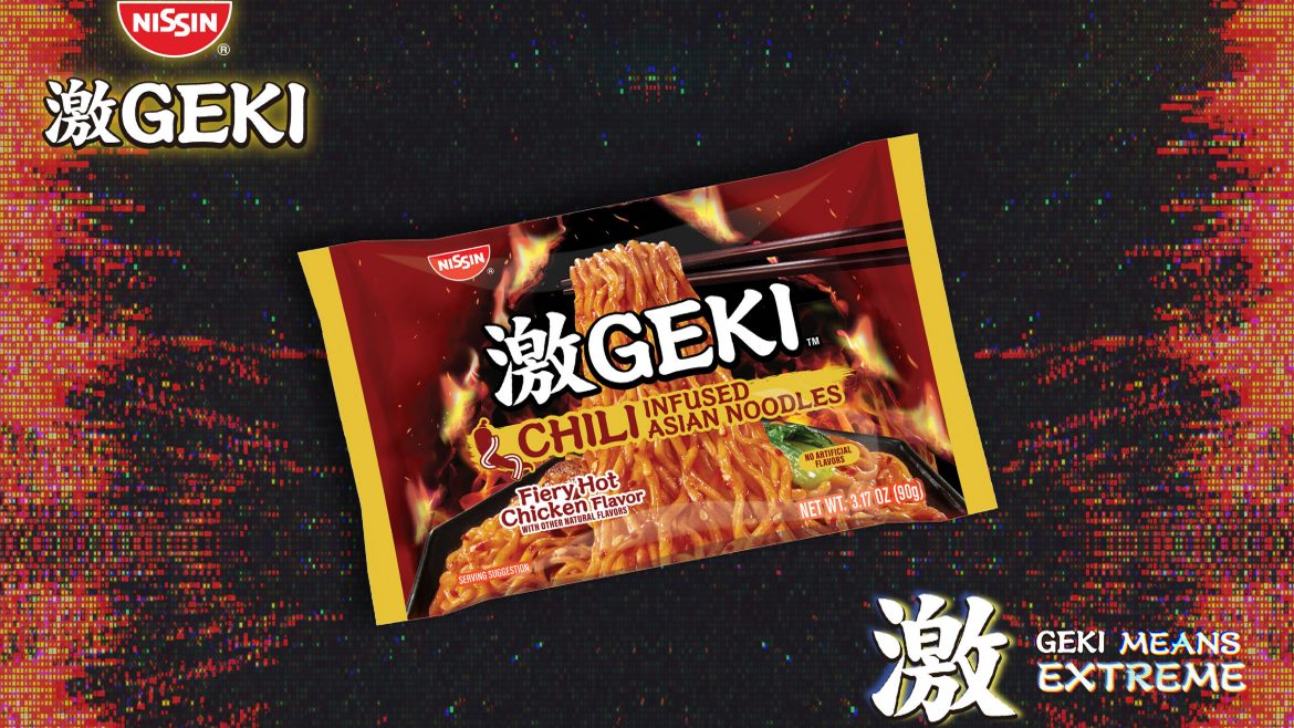 GEKI's first consumer offering, GEKI Fiery Hot Chicken, is made with chili-infused noodles to deliver spice and flavor. The product introduces a manufacturing technology developed by Nissin Foods USA, infusing chili flakes directly into the round noodles to generate a red hue and heat from within. This heat from the noodles is balanced with flavor from a fiery hot chicken seasoning packet.