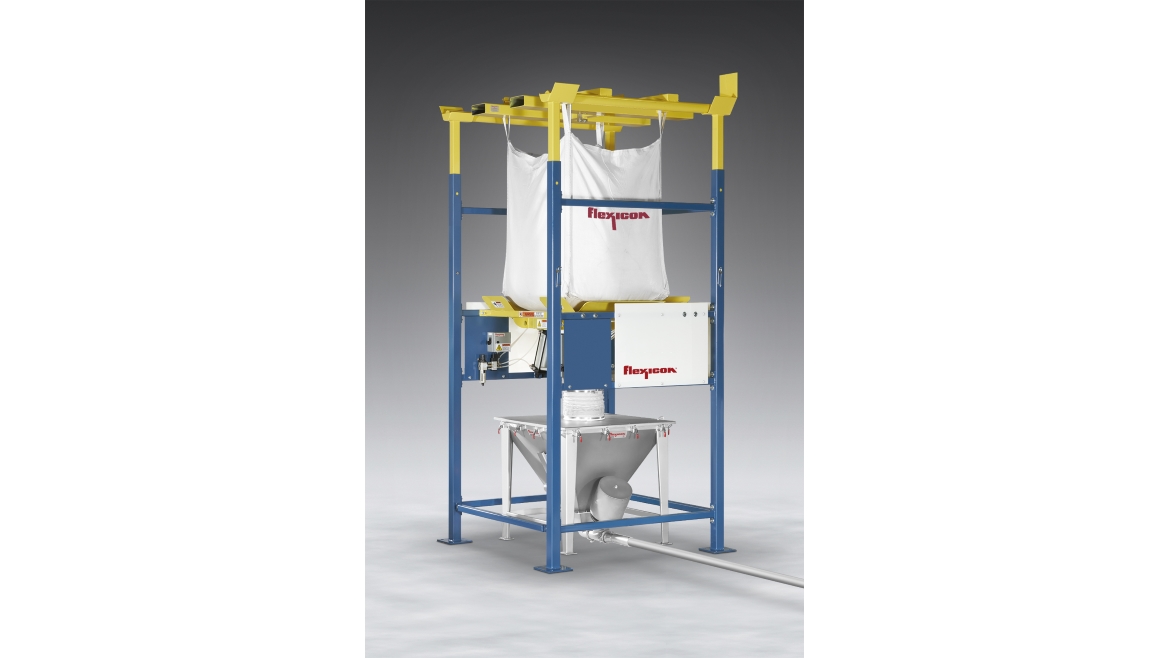 Concurrently, FLOW-FLEXER bag activators raise and lower opposite bottom edges at timed intervals to loosen compacted materials and ultimately raise the bag bottom into a steep "V" shape for total evacuation with no manual intervention. The enclosed hopper charges a Non-Flow-Through (flood feed) pick-up adapter that feeds vacuum conveyor lines.