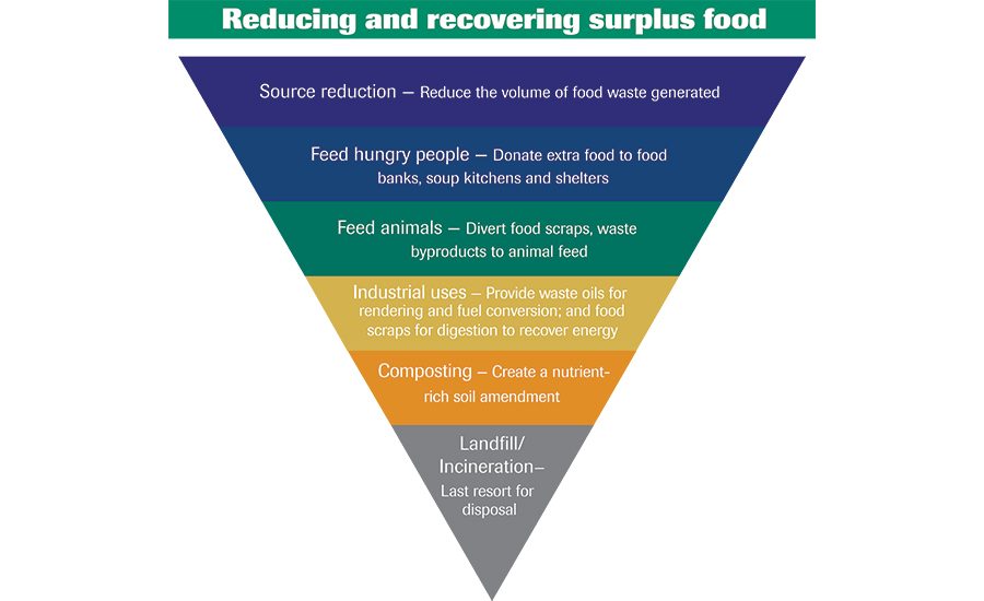 Surplus food, byproducts and organic waste can be beneficially used in a variety of ways. The Food Recovery Hierarchy prioritizes methods of reducing food waste from most desirable (top) to least desirable (bottom). Source: EPA.