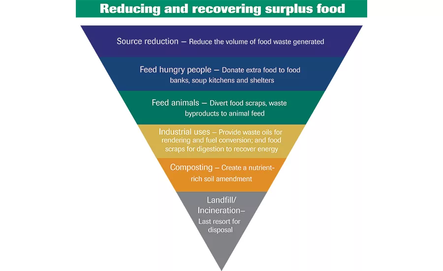 Compared to other manufacturers, food and beverage processors face a unique problem: Excess product usually has a relatively short shelf life. This is why the EPA came up with an inverted pyramid (see graphic on this page) showing the preferred hierarchical ways of disposing of surplus product and waste. Of course, the last step any processor wants to take is sending these to a landfill, and thankfully, there are practical alternatives. For example, some options include feeding people the surplus food, using it for animals, recycling/reusing it for industrial purposes and composting it to create nutrient-rich soil.