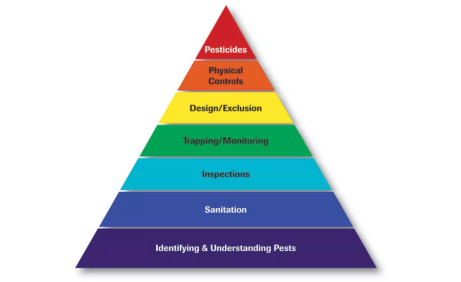 For Jerry Heath, product manager at Industrial Fumigant Company, the go-to method for understanding IPM is the pest pyramid, a virtually universal tool companies can use to build their control plans from the ground up. In the base of the pyramid are identifying and understanding pests. Above this level are the tiers for sanitation, inspections, trapping/monitoring, design/exclusion, physical controls and pesticides. Each level of the pyramid, with the exception of the bottom, is built based on information gathered from the previous level.