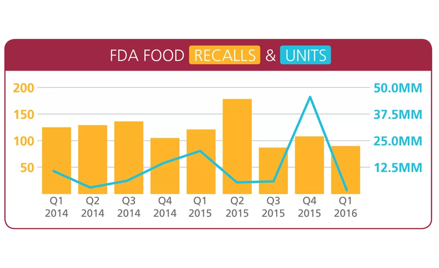 According to the Stericycle Recall Index released last month, the food and beverage category decreased in both units and number of recalls in the first quarter of 2016 compared to the fourth quarter of 2015.
