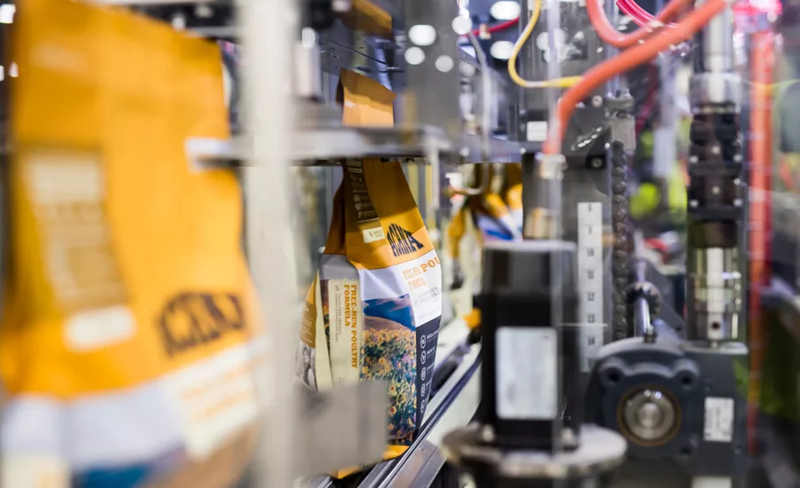 Champion Petfoods is committed to using fresh and local ingredients as stated in its BAFRINO mission, which stands for Biologically Appropriate, Fresh Regional Ingredients, Never Outsourced. Dave Pashley, vice president of operations, says the company works with regional botanical growers and meat and poultry producers for their supply needs. To accommodate the inclusion of fresh ingredients, a 25,000-sq.-ft. refrigerator was installed and can hold 600,000 pounds of meat, fish, poultry, fruit, vegetables and botanicals. Additionally, the commercial food grinder and plate freezers allow for quick preservation of fresh ingredients.
