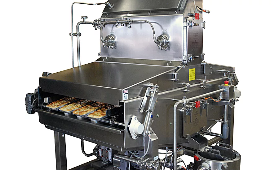 The GOE liquid sprayer applies glazes, release agents, seasoning infused liquids and oils, egg wash and adherents to buns, crackers, cookies, pastries and breads. The trim plate eliminates overspray; sprayed liquid that is not applied to products is recovered and reused. The totally enclosed, self-contained system meets or exceeds ANSI Z50.2 sanitation standards. Standard widths of application are from 12 to 84 in.