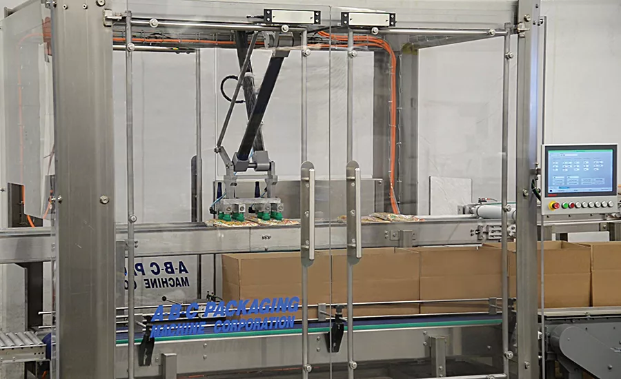 The A-B-C Model 600 robotic packer runs multiple flexible package styles with a variety of infeed options. It is equipped with a high-payload 2-axis robotic arm that can be programmed for virtually any packing configuration, while the operator station offers control in a concise interface, including setup, operation, real-time and historical status reports, maintenance alerts and fault detection for troubleshooting. Offered in painted steel construction with interlocked guard doors, the packer also is available in stainless steel with washdown-rated components.