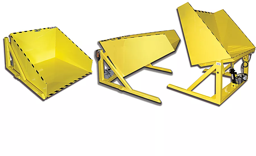 Verti-Lift Zero pan tilters can be loaded or unloaded at ground level, eliminating the need for a forklift. The electronically actuated or manually operated devices are available in a range of sizes, with capacities of 2,000/4,000 lb. and 0° to 90° of tilt. They can be loaded or unloaded with a pallet jack or pallet truck at floor level.