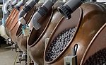 The smell of the nuts and the sugar fills the air, and the three copper cauldrons are heated to 180°C for 15 minutes for each batch. The pralines are then cooled on long tables before being broken down to be used in some of the chocolates made at the factory.