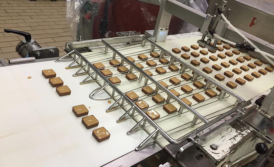 The chocolate bars are produced on a line, and the process starts with the chocolate being poured into the molds and then run through the Sollich tempering machine.