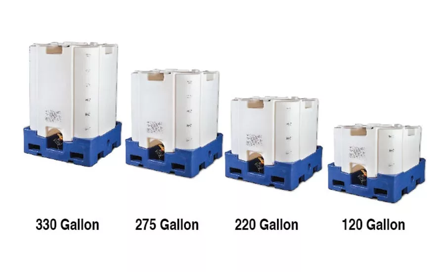 Elkhart Plastics intermediate bulk containers are made of molded plastic components instead of steel-cage designs. The containers are available in 120-, 220-, 275- and 330-gallon sizes. The containers can be customized with food-safe and recyclable resins; a range of colors; and multiple inset logo and labeling options. The containers can be stacked, washed and reused.
