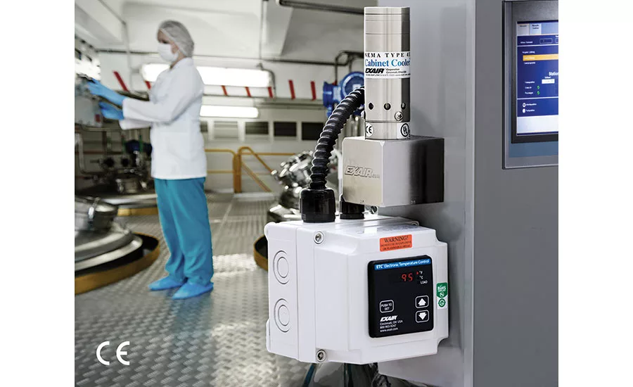 Used with food processing control panels, EXAIR Small 316 stainless steel cabinet coolers with electronic temperature control keep electrical enclosures cool with 20°F air. A digital LED readout displays the temperature of the electrical enclosure; when the user temperature setting is exceeded, the system is activated. The UL-listed, CE-compliant coolers come with cooling capacities of 275 and 550 BTU/hr.; cooling capacities up to 5,600 BTU/hr. for NEMA 12, 4 and 4X enclosures are available