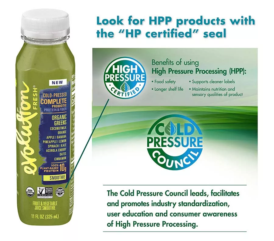 Evolution Fresh’s Fruit & Vegetable Juice Smoothie has the new CPC “HPP Certified” seal, as well as USDA’s “Organic” seal. Look for more “HPP Certified” labels as food and beverage companies adopt Cold Pressure Council’s certification. Sources: Evolution Fresh and Cold Pressure Council.