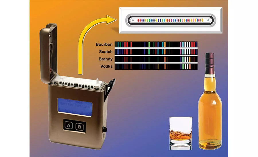 This handheld analyzer with colorimetric sensor array is able to identify liquors and determine if they are real or counterfeit.