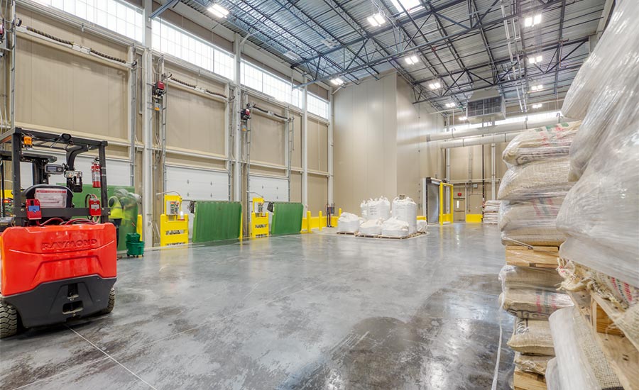 The Starbucks August, Ga., facility’s receiving area accepts deliveries of green coffee beans that are stored for roasting. Stellar’s expansion added six new whole bean roasters, allowing the facility to produce up to 146.8 million pounds of coffee per year.