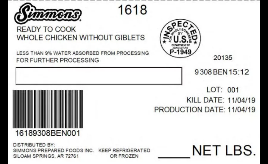 Simmons Prepared Foods establishments discovered the problem during further processing.