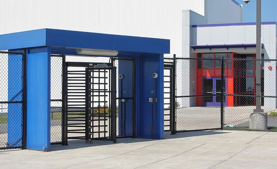 This facility requires card access at the entrance to pass through the full-height turnstile, outfitted with microphones and cameras, and yet another card access to enter the main plant area once inside the reception center. Truck access is through a guard shack on the side of the property.