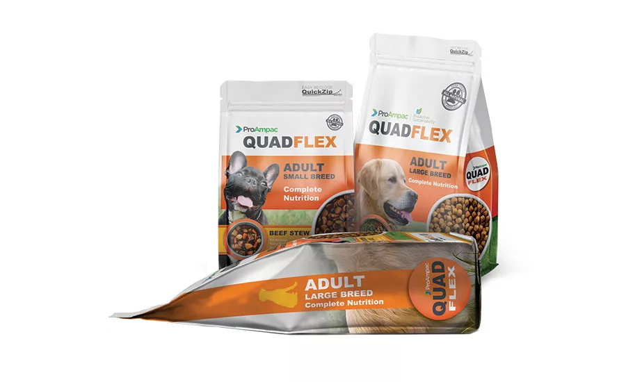 ProAmpac’s premium pet food solution, QuadFlex, has a quad-seal design with ideal shape, strength and shelf presence, along with plenty of branding space. The company recently introduced a recyclable version.