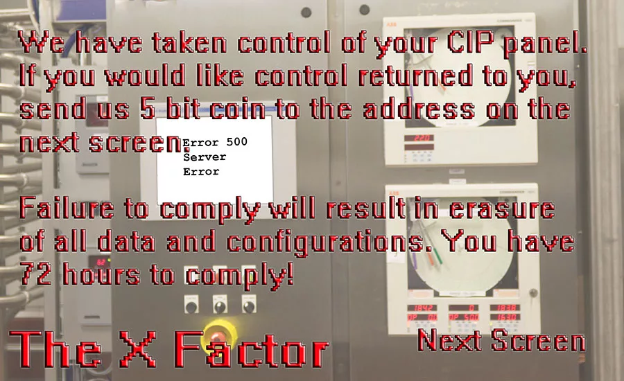 Even if you can manage to prevent ransomware entering the process control system from the IT network, it can still find its way via other routes to key OT systems, such as a CIP system. Imagine CIP temperatures not being met or too much or not enough chemicals with not enough rinse—all ways to make you throw away a batch if you catch it. What happens if you don’t? Photo: Wayne Labs