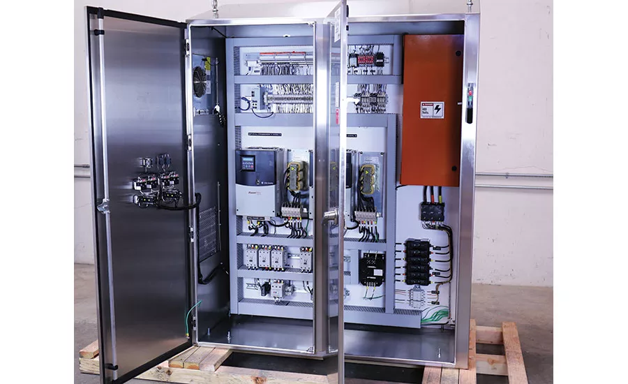 This spiral freezer control panel, shown preinstallation, is equipped with VFDs for fan control. The controls work together with process controls and refrigeration system controls, increasing efficiency and saving energy.