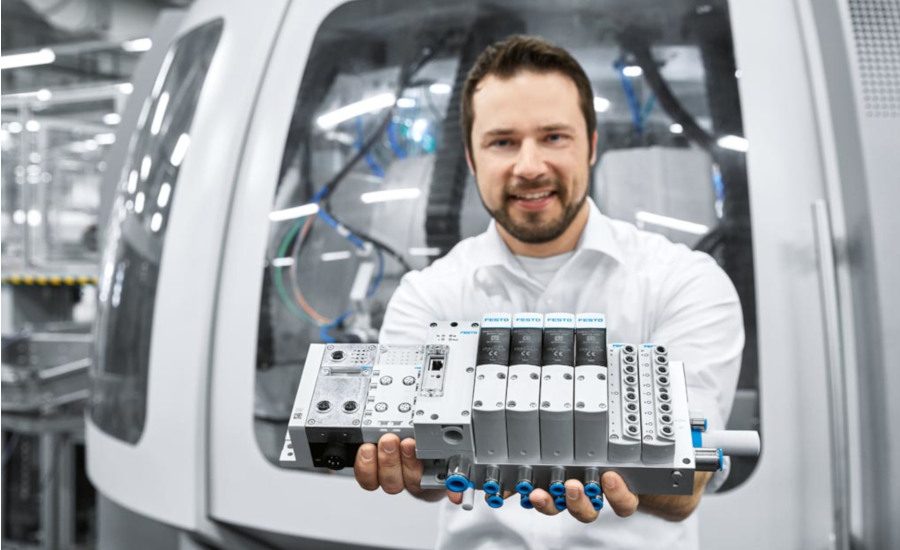 The VTEM motion terminal by Festo is a smart valve terminal, which measures and controls pressure and flow and air consumption for every valve and offers predictive failure analysis. Photo courtesy of Festo