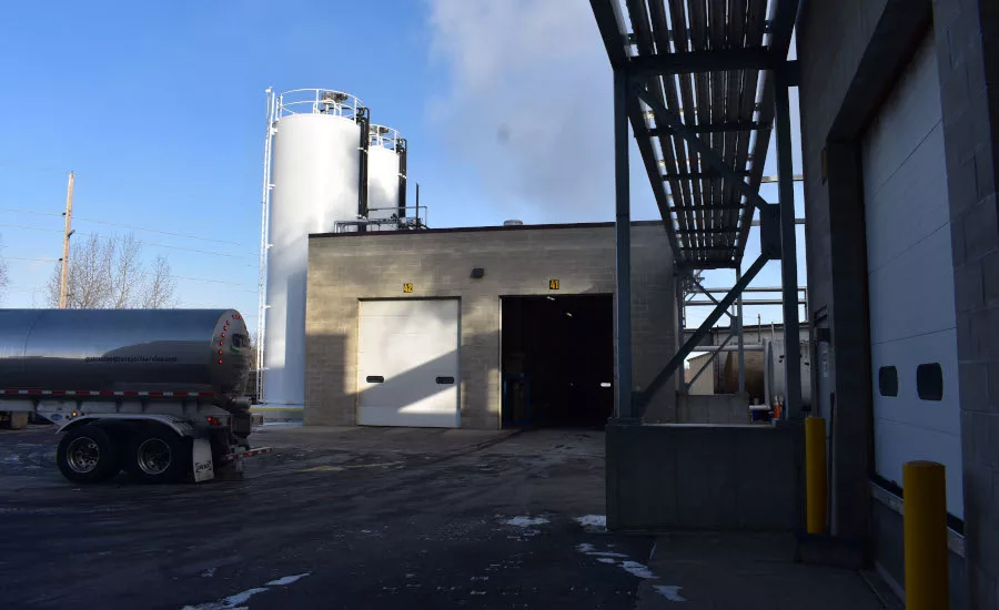Finished oatbase is stored in one of two large silos until it is loaded into tankers. Pictured above, the transfer piping is contained in an overhead pipe bridge and fills the silos via a valve cluster contained in the load out bay shown in the background.
