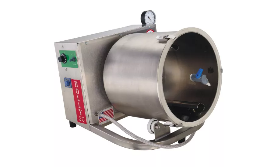 Model HVT-30 is designed to increase yield, tenderize product, reduce cook time and evenly distribute flavor throughout product whether it is meat, fish or poultry. The unit features a built-in vacuum pump; programmable timer; 25 lb. max.; working capacity; variable speed from 1 to 18 rpm; compact size (22" x 21" x 17" and 42 lbs.); 110/220 V, 50/60 Cycle, 1 Phase; see-through processing lid; and removable stainless steel tank with baffles.