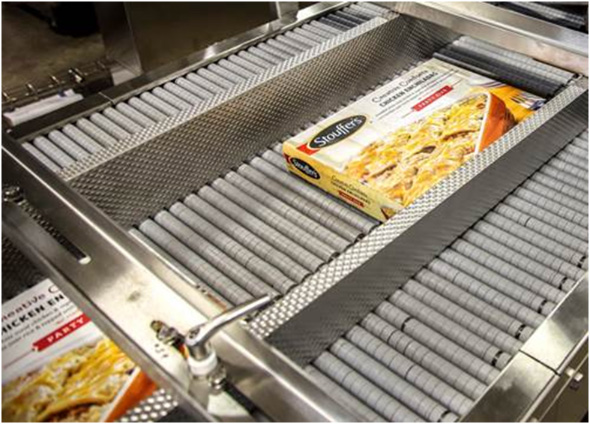 Conveying frozen ready-to-eat meals through to secondary packaging. Photo courtesy of Shuttleworth