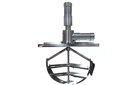 Built to blend and fold foods with various viscosities, the Lee Industries 30° inclined, double-motion agitator is used in conjunction with a hemispherical bottom kettle.