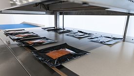 System includes tool-less removable stainless steel shelving for product storage containers that are positioned for operators to slide bulk food directly into clamshell trays for manual lid closure.